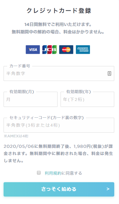 クレジットカード登録画面が表示されるので、「カード番号」「有効期限」「セキュリティーコード」を入力して、「利用規約に同意する」にチェックを入れる。